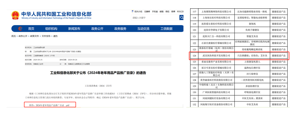时间来到2024年,工业和信息化部发布的《2024年老年用品产品推广目录》中,中国灸系列产品再次入选。